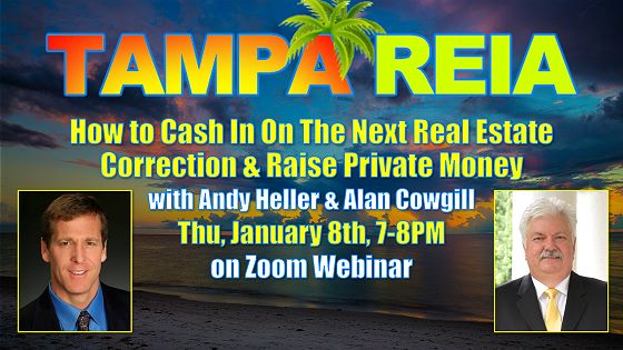 - THU, January 8th at 7PM: Tampa REIA ONLINE Meeting on Zoom Webinar on “How to Cash In On The Next Real Estate Market Correction” with Andy Heller & Alan Cowgill