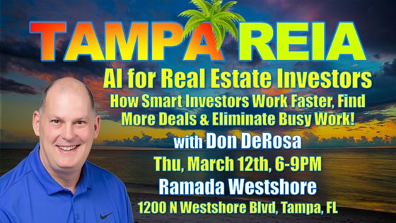 - THU, MAR 12th: Tampa REIA on “AI for Real Estate Investors – How Smart Investors Work Faster, Find More Deals & Eliminate Busy Work!” with Don DeRosa